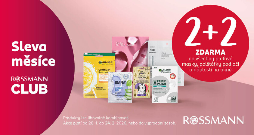 Využijte akci 2+2 na všechny pleťové masky, polštářky pod oči a náplasti na akné.