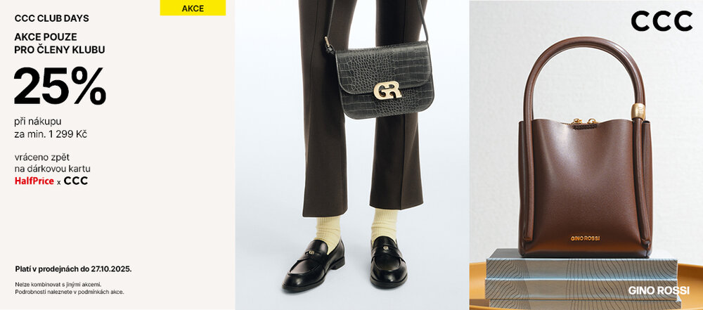 Členové Klubu získají 25 % zpět na dárkovou kartu CCC x HalfPrice při nákupu za min. 1299 Kč.