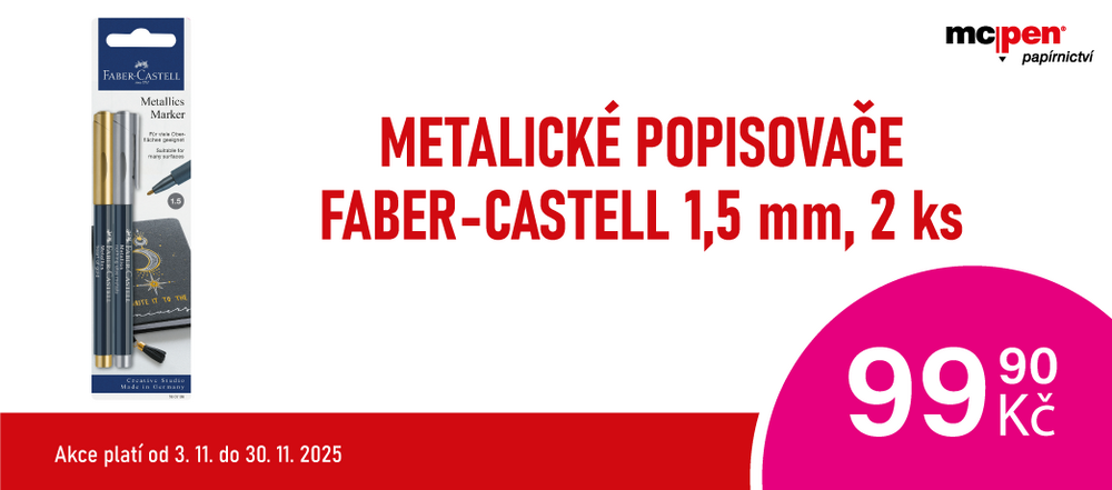 Rozjasněte své nápady s metalickými popisovači Faber-Castell. Tyto univerzální popisovače s pH neutrálním, voděodolným inkoustem odolným vůči slunečnímu záření píší nejen na světlý a tmavý papír, ale i na sklo, porcelán, kov či plast. Jsou připravené k okamžitému použití – bez třepání, bez pumpování, prostě otevřít a tvořit.