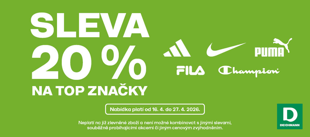Dobrá zpráva pro všechny milovníky TOP značek. V prodejnách Deichmann na vás stále čekají oblíbené kousky se slevou 20 %. Ano, slyšíte správně — akce na značky Adidas, Nike, Puma, Fila a Champion byla prodloužena.